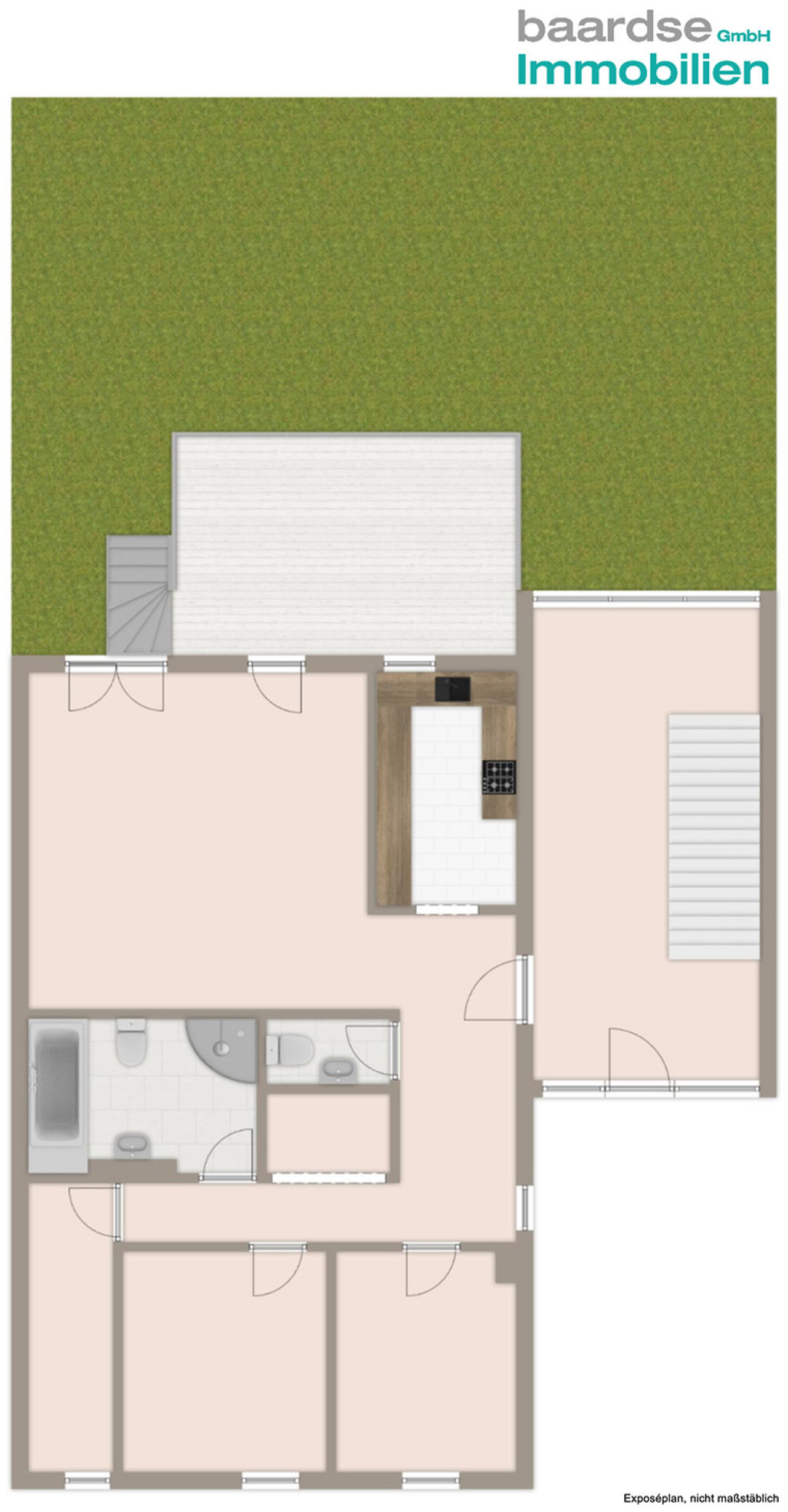 Die Wohnung besteht aus einem sehr gut belichteten Wohnzimmer mit Zugang zur Terrasse und zu Ihrem eigenen Garten, einem Schlafzimmer, einem Büro oder Kinderzimmer, einem Gäste-WC, einem großen Badezimmer mit Wanne und Dusche, einer Abstellkammer mit Waschmaschinenanschluss und einer Diele mit Garderobe.
